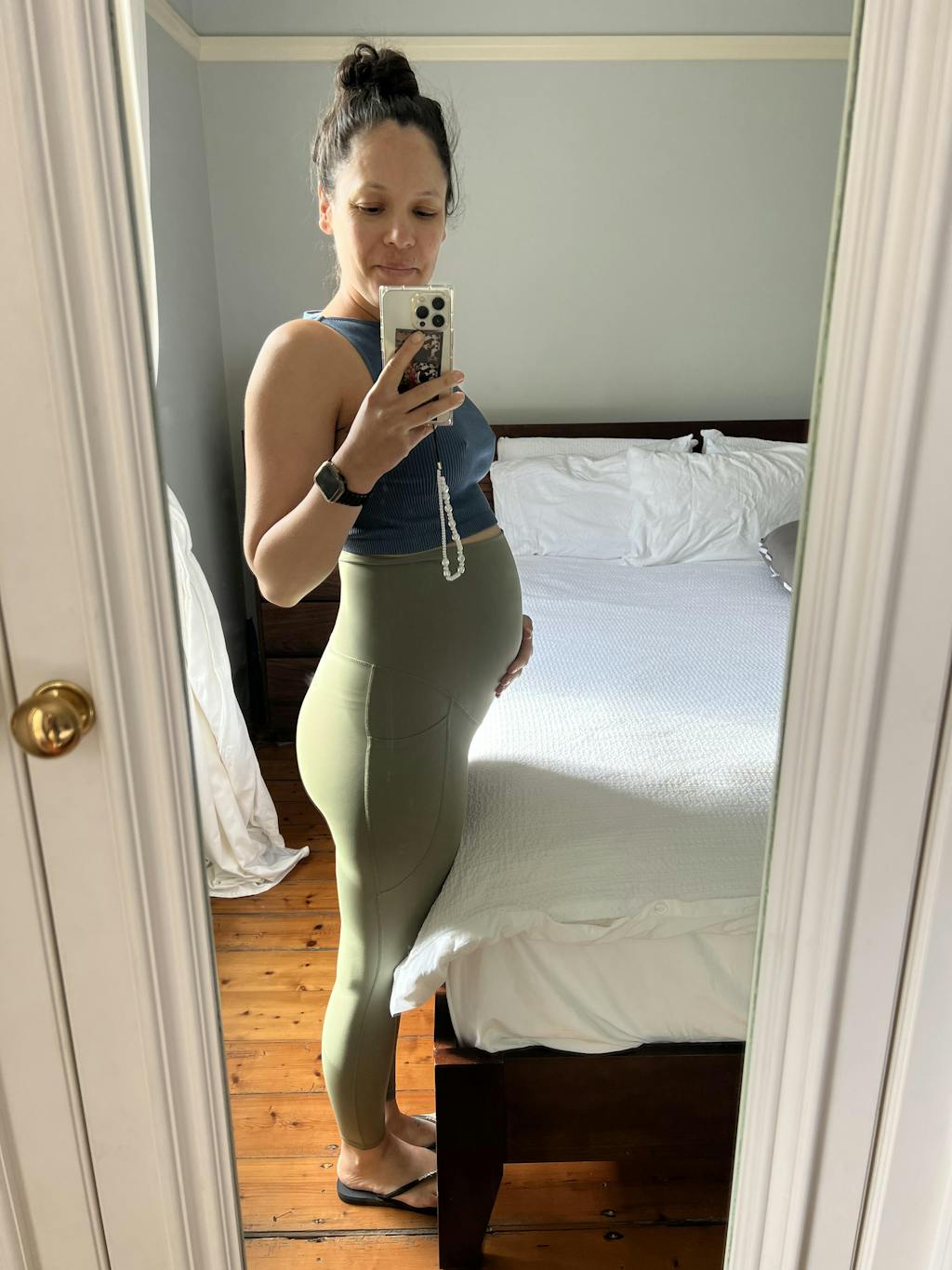 PROS: it’s soft feeling and repels pet hair, lint etc…it also doesn’t have a crotch lining which is awesome! I love pockets too on every pair of athleisure tights I wear for my phone, keys, AirPods.
